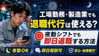 工場勤務・製造業の方が退職代行を使って即日退職する方法を解説。夜勤・シフト制・寮住まい・期間工でも利用可能。雇用形態別の注意点やおすすめサービスも紹介。